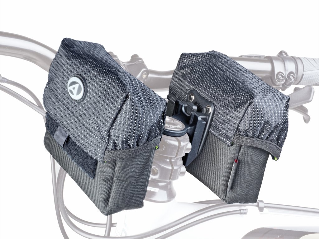 Brašna na představec, universální držák umožňuje velmi snadné sejmutí/ upevnění, 2 samostatné kapsy s podšívkou z nepromokavého materiálu. Rozměry (d × š × v) 12,5 × 9 × 4 cm, objem 2× 0,75 l.