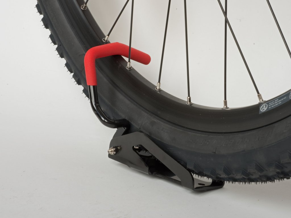 Univerzální držák k zavěšení jízdních kol všech typů na zeď za přední nebo za zadní kolo.