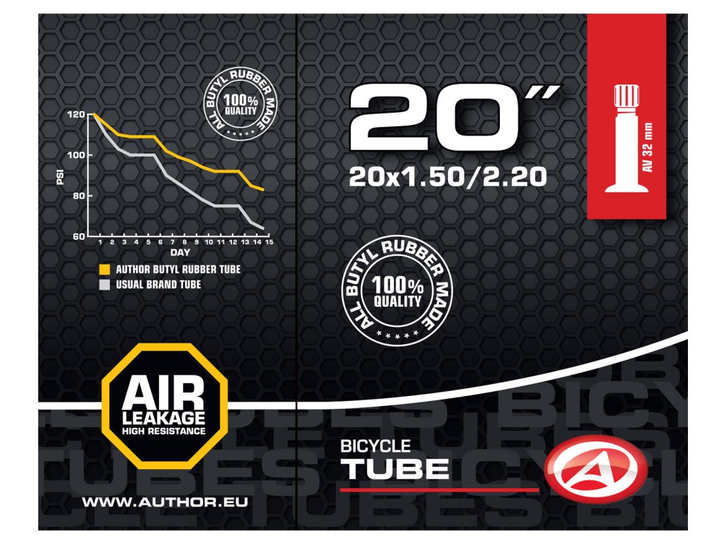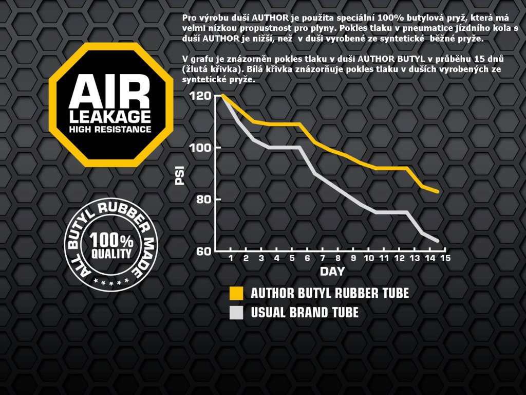 Duše AUTHOR 20x1.50-2.20 vyrobená ze 100% butylové pryže s velmi nízkou propustností pro plyny. Udrží tlak vzduchu v pneumatice jízdního kola po delší dobu, než duše vyrobené ze syntetické pryže.