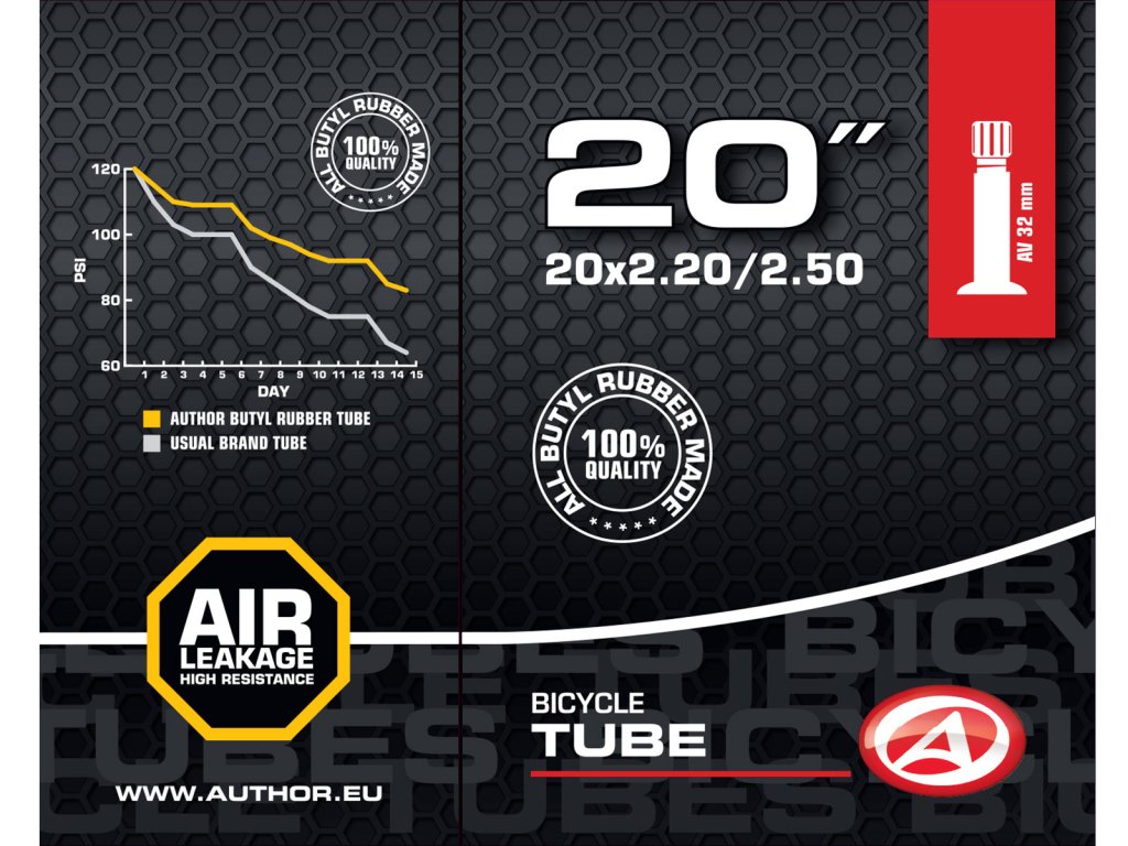 Duše AUTHOR 20x2.20-2.50 vyrobená ze 100% butylové pryže s velmi nízkou propustností pro plyny. Udrží tlak vzduchu v pneumatice jízdního kola po delší dobu, než duše vyrobené ze syntetické pryže.