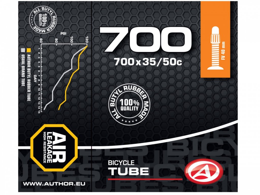 Duše AUTHOR 700x35/50C vyrobená ze 100% butylové pryže s velmi nízkou propustností pro plyny. Udrží tlak vzduchu v pneumatice jízdního kola po delší dobu, než duše vyrobené ze syntetické pryže.