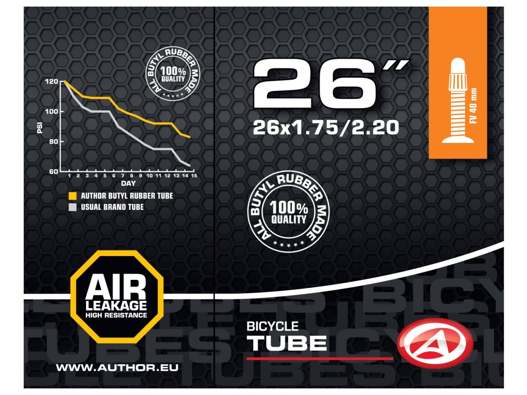 Duše AUTHOR 26x1.75-2.20 vyrobená ze 100% butylové pryže s velmi nízkou propustností pro plyny. Udrží tlak vzduchu v pneumatice jízdního kola po delší dobu, než duše vyrobené ze syntetické pryže.