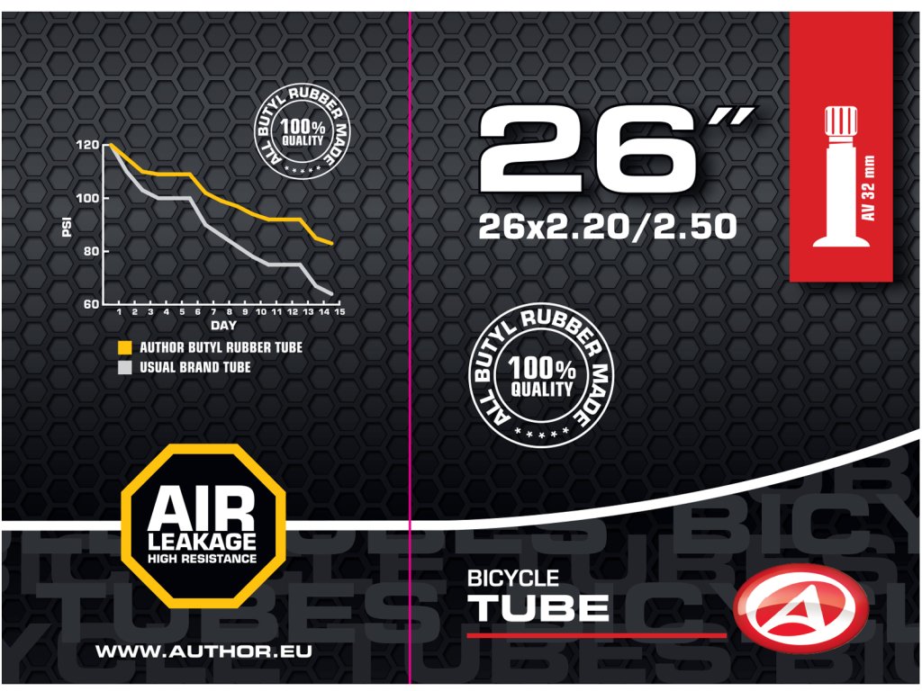 Duše AUTHOR 26x2.20-2.50 vyrobená ze 100% butylové pryže s velmi nízkou propustností pro plyny. Udrží tlak vzduchu v pneumatice jízdního kola po delší dobu, než duše vyrobené ze syntetické pryže.