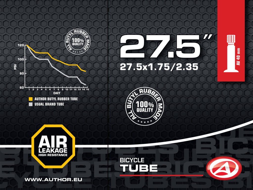 Duše AUTHOR 27,5x1,75-2,35 vyrobená ze 100% butylové pryže s velmi nízkou propustností pro plyny. Udrží tlak vzduchu v pneumatice jízdního kola po delší dobu, než duše vyrobené ze syntetické pryže.