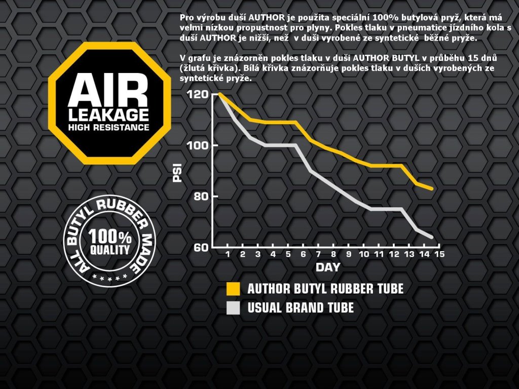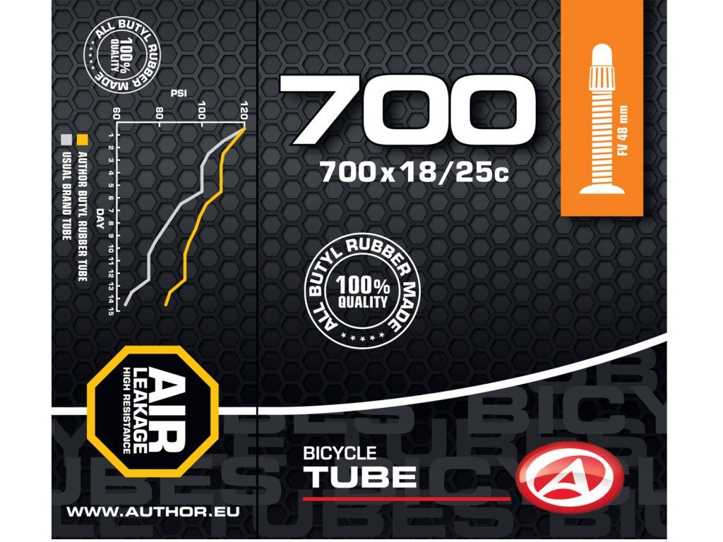 Duše AUTHOR 700x18/25C vyrobená ze 100% butylové pryže s velmi nízkou propustností pro plyny. Udrží tlak vzduchu v pneumatice jízdního kola po delší dobu, než duše vyrobené ze syntetické pryže.