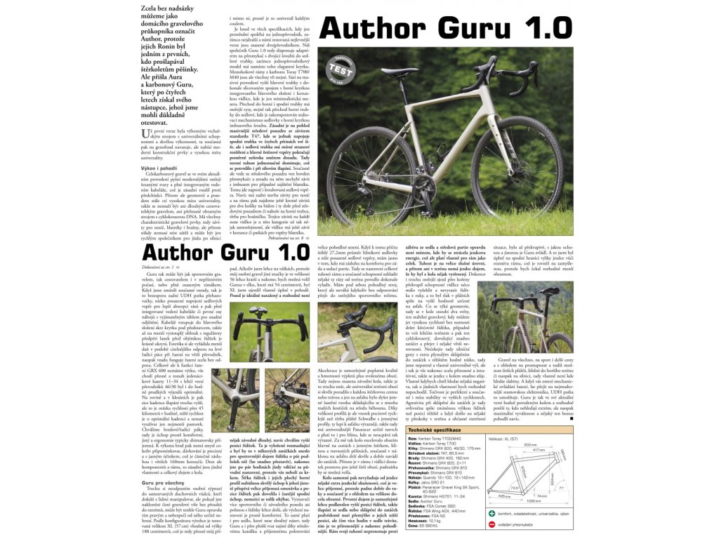 Karbonový model značky Author v kategorii tolik oblíbených gravelů. To je Author Guru 1.0, který se za relativně krátkou dobu vyšvihl mezi nejpopulárnější kola ve své třídě. Vděčí za to hlavně lehkému karbonovému rámu s vnitřním vedením hadiček a bovdenů, který disponuje velmi praktickými montážními body na různé brašny a nosiče. Má univerzální geometrii na úrovni sportovního a komfortního naladění. Řazení má na starosti speciální gravelová sada Shimano GRX ve verzi 2 × 11 převodů. Standardem jsou hydraulické kotoučové brzdy Shimano a s tím související pevné osy vpředu i vzadu. Obrovská popularita těchto kol souvisí s jejich nekonečnou přizpůsobivostí – s hladkými užšími plášti je to sportovní raketa, která nechá za sebou i klasická silniční kola. Naopak při použití širších gum s terénním vzorkem dokáže letět i po štěrkových cestách překvapivě rychle a přitom komfortně. Při osazení nosiči a brašnami bude plnit roli turistického kola na několikadenní expedici.