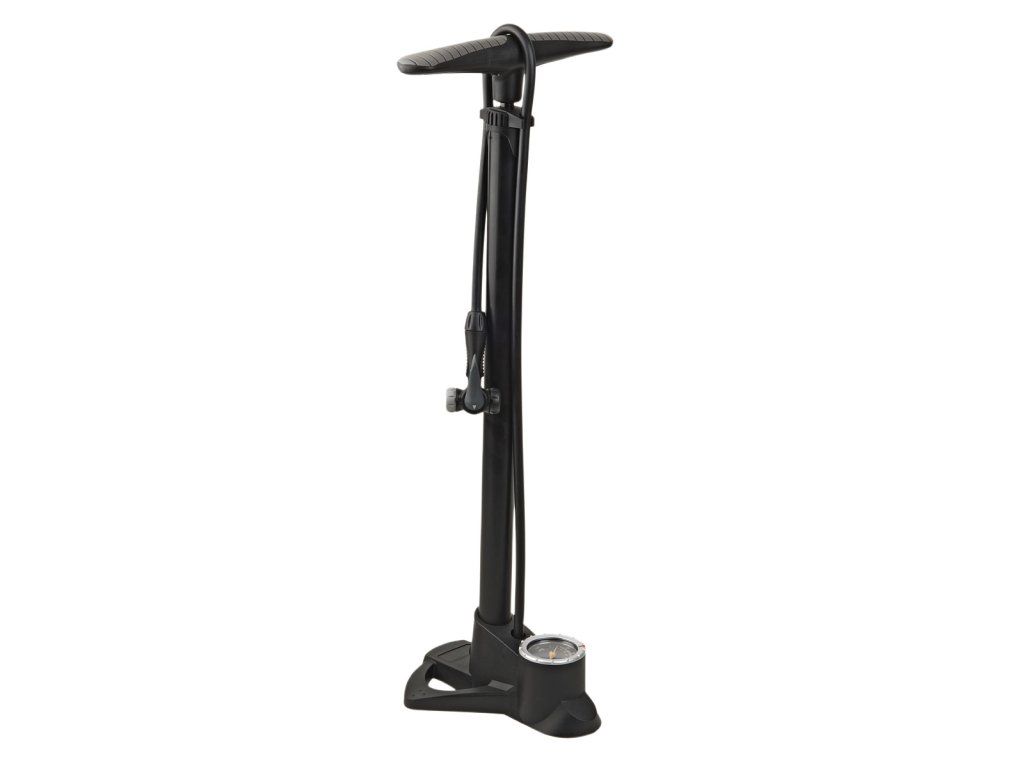 Nožní hustilka s manometrem, univerzální DualHead 2 oboustranná hlava pro všechny typy velo ventilků. Materiál kompozit / ocel. Válec d. 32 mm × l. 540 mm, max. tlak 160 PSI (1,1 MPa).