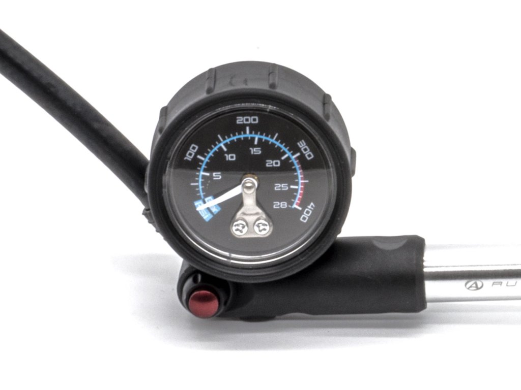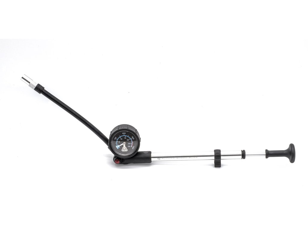 Hustilka na odpružené vidlice a zadní pružící jednotky, zpětný ventil pro možnost snížení tlaku, materiál AL6061 / Cr-Mo, max. tlak až 300 PSI (2 MPa), rozměr 60 × 250 mm, hmotnost: 146 g.