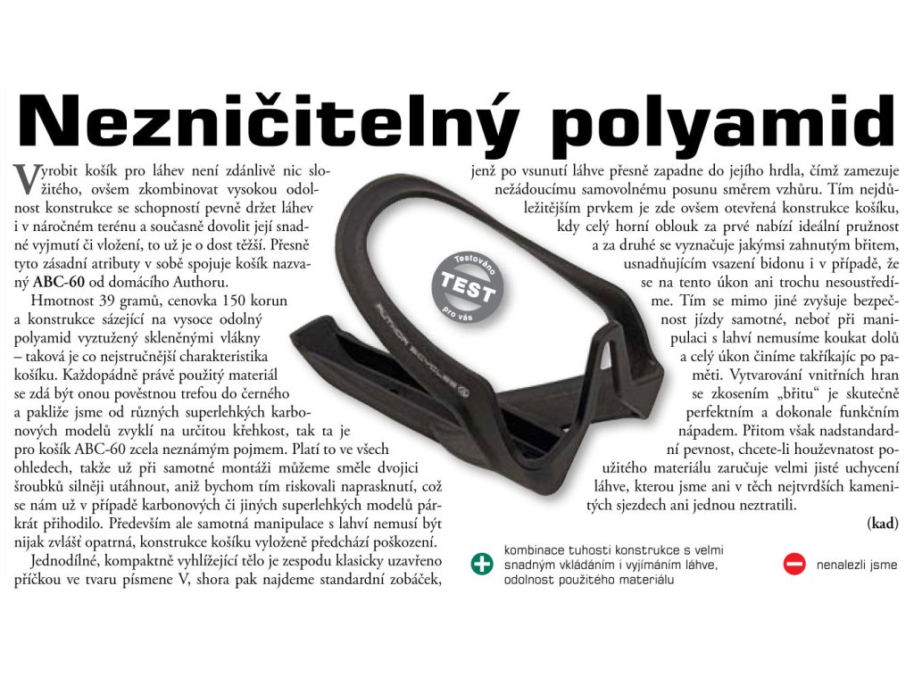 AUTHOR ABC-60 je jednodílný košík na láhev vyrobený z odolného polyamidu vyztuženého skleněnými vlákny se stylovým lesklým povrchem. Je velmi lehký a má tvarované vnitřní hrany, které usnadňují vložení a vyjmutí láhve. Díky otevřené konstrukci je vhodný pro všechny velikosti cyklistických lahví.