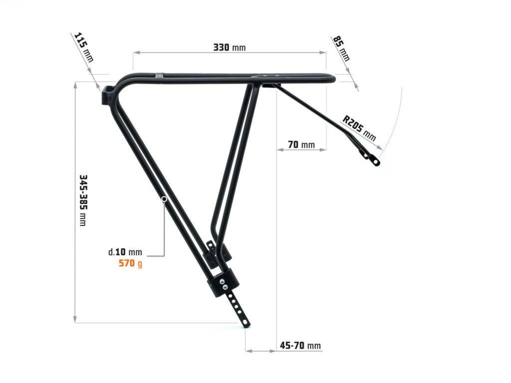 - Nastavitelná délka vzpěr pro kola průměru 26" / 27,5" / 28" (700 C) a 29". Polohovatelné horní vzpěry.