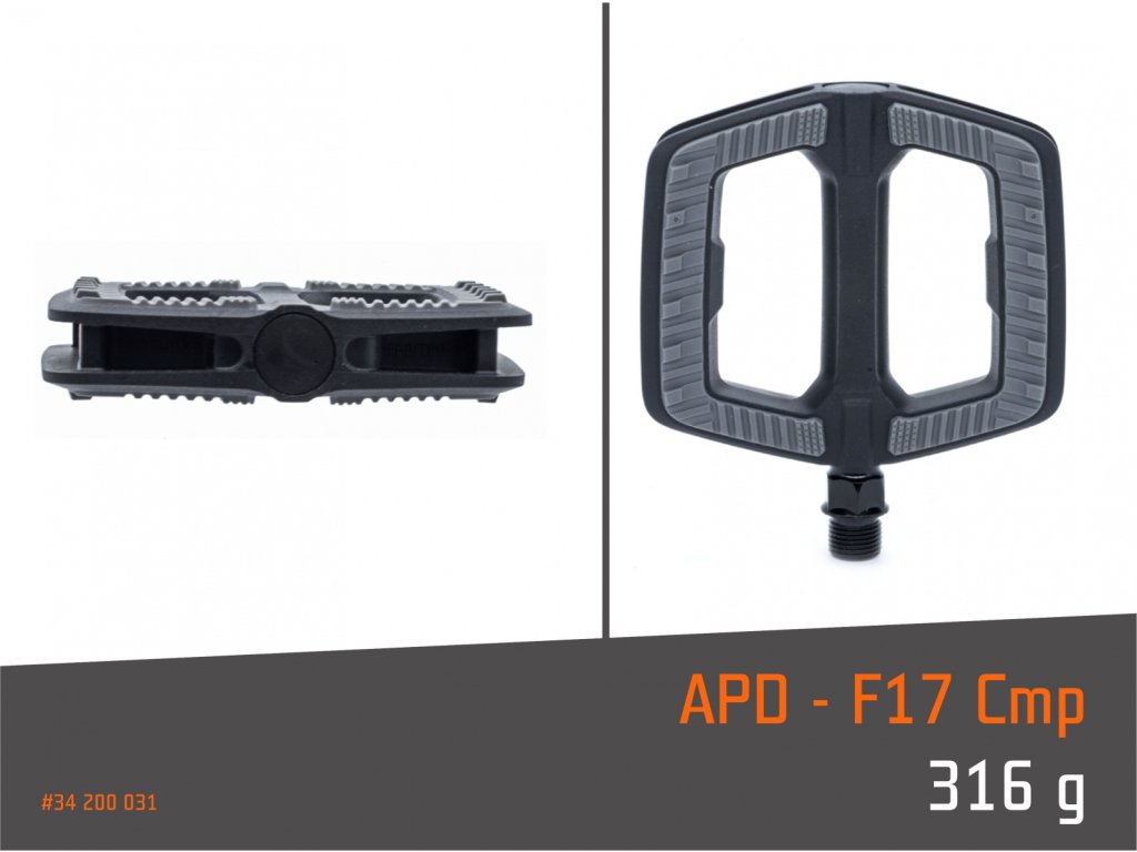Pedály AUTHOR APD F17 CMP jsou ideální volbou pro jezdce, kteří hledají jistou oporu nohy při jízdě na kole a používají obuv s různými podrážkami. Jsou vhodné pro většinu typů jízdních kol ( horských, krosových, trekingových nebo městských). Pedály APD F17 mají kvalitní kluzné uložení ocelové osy v polymerovém pouzdře.