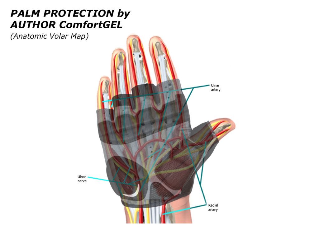 - GEL výstelky jsou umístěny podle anatomické mapy dlaně, s cílem zmírnit tlak a chránit citlivé oblasti ruky, snižují tak necitlivost v ruce.