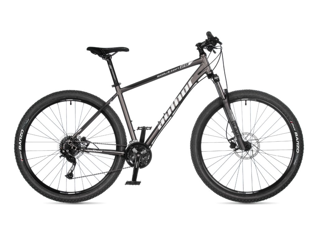 Jeden ze základních modelů 29“ horských kol v nabídce značky Author. To je Solution 29, navržený s ohledem na co nejlepší cenu a zároveň solidní výbavu. Duralový rám se může pochlubit vnitřním vedením řadicích bovdenů, odlehčenými patkami s přípravou na montáž integrovaného stojánku a závitovými otvory na nosič a blatníky. Odpružená vidlice RST disponuje mechanickým zamykáním a nastavitelnou tuhostí pružiny. Řazení je opět v režii spolehlivé sady Shimano Alivio s tradičním počtem rychlostí 3 × 9. Zastavení mají na starost velice účinné hydraulické kotoučové brzdy Tektro. Jak je u značky dobrým zvykem, ostatní komponenty jsou vlastní produkce Authoru. Nadstandardním komponentem v této třídě jsou určitě značkové pláště Vittoria. Ideální model pro začínající nenáročné zákazníky, kteří si mohou vybrat z 3 různých velikostí a dvou barevných variant.