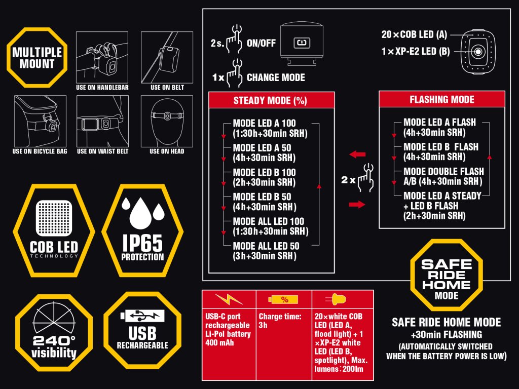 - SafeRide Home mode – při nízké kapacitě baterie se světlo automaticky přepne do úsporného režimu, ve kterém vydrží svítit 30 minut.