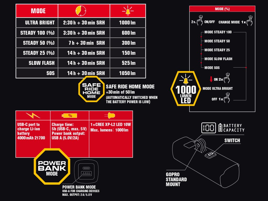 - Safe Ride Home mode – při nízké kapacitě baterie se světlo automaticky přepne do úsporného režimu, ve kterém vydrží svítit 30 minut.