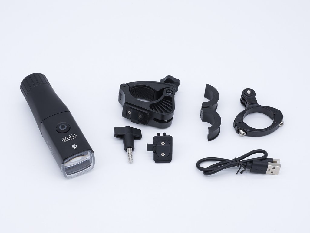 - Samostatný držák s GoPro standardem a objímkou pro průměr 31,8 mm ( uchycení světla pod řídítka).