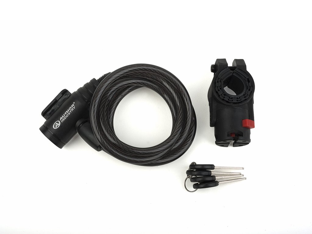 Spirálový zámek s univerzálním otočným držákem na sedlovku, lanko ocel l. 1500 mm, 4x klíč.