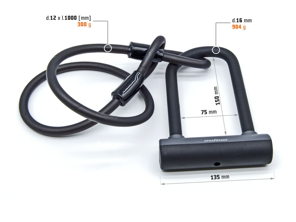 - Parametry U-zámku: 205 x 135 mm, průměr třmenu : 16 mm ( třmen d. 14 mm), hmotnost 904 g.