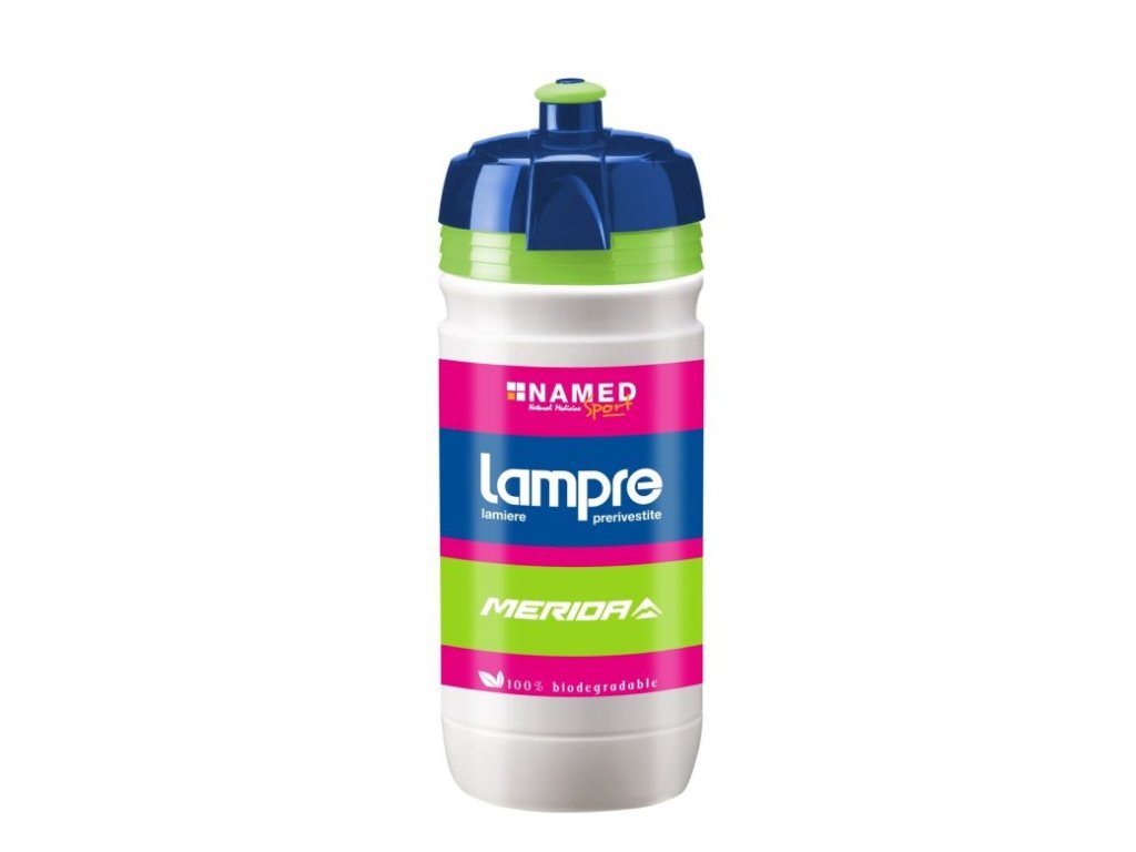 Cyklistická lahev Elite v týmových barvách stáje LAMPRE-MERIDA. Setkat jste se s nimi mohli například při slavné Tour de France, kde tyto lahve, jenom s jiným potiskem, používá většina týmů.