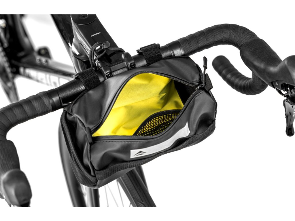 Brašna na řídítka pro silniční nebo šotolinový výlet Možnost uložit si to nejdůležitější, jako je nářadí, svačina, peníze, klíče nebo telefon může být skutečným zlepšením vašeho zážitku z jízdy. Naše kompaktní brašna na řídítka nabízí úložný prostor o objemu 1,3 l, což je dostatečné množství na to, abyste mohli převážet to, co potřebujete, úhledně připevněné k řídítkům. Materiál odolný proti roztržení a vodě pomáhá, aby se brašna stala celoročním doplňkem, a reflexní potisk zvyšuje vaši viditelnost v šeru. Vnitřní přepážky a vnější kapsy ze síťoviny udržují pořádek a nastavitelné popruhy udržují brašnu pevně na místě. Rozměry: Objem: 1,3l Průměr: 10cm Délka: 20cmDoplňkové parametry