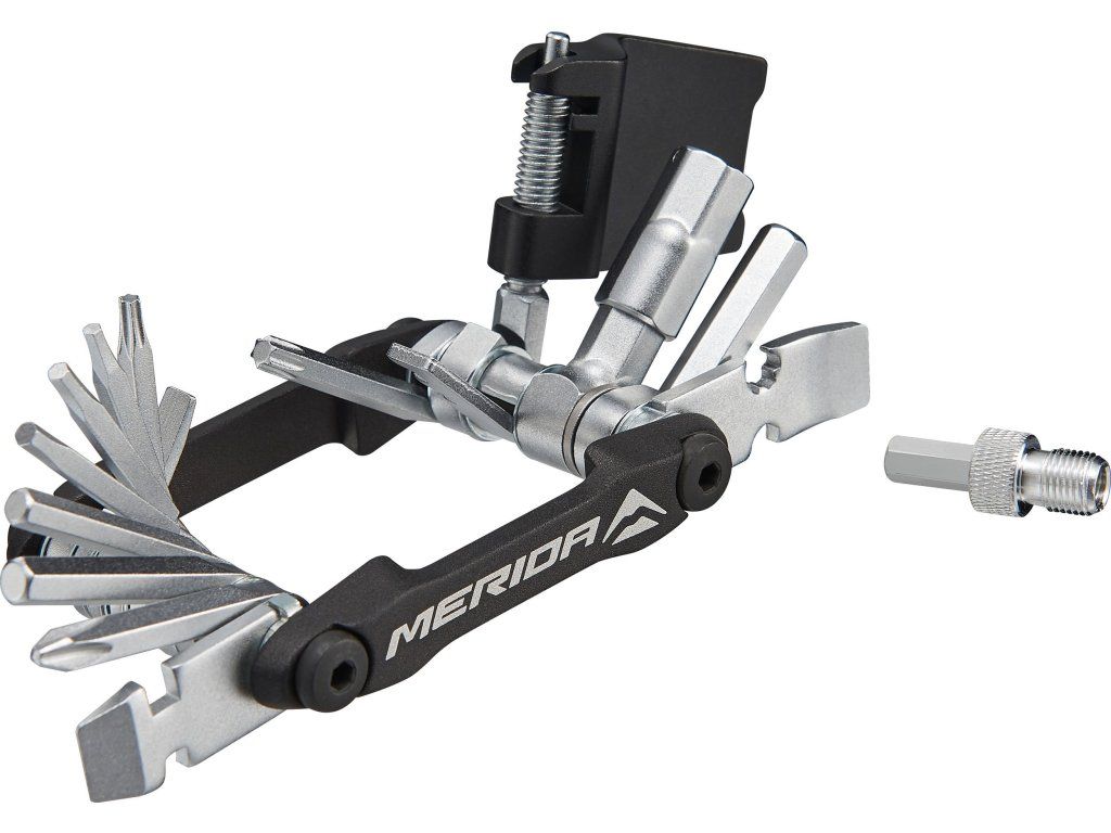 MERIDA - nářadí mulitfunkční 24 IN 1 váží pouhých 150 g a snadno se vejde do kapsy nebo batohu. Je vyrobeno z přesného a odolného hliníku a je vybaveno imbusovými klíči 2/2,5/3/4/5/6/8/10 mm, křížovými a plochými šroubováky, klíči T10/T25/T30 Torx, pákami na pneumatiky, nástrojem na zatlačení destiček kotoučových brzd a malým pravítkem na měření průhybu. Má centrovací klíč, který se hodí pro G13/G14/G15/G16/Shimano hex 4,6/Mavic M7, a nýtovačku řetězu pro 9/10/11 rychlostí. Dodává se s neoprenovým návlekem.