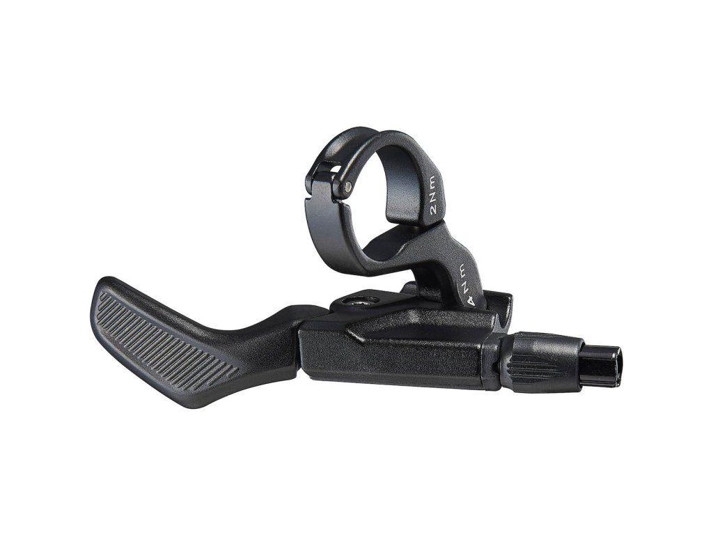 Páčka ovládání teleskopické sedlovky Merida Montuje se pod řídítka a je snadno ovladatelná v každé jízdní situaci.