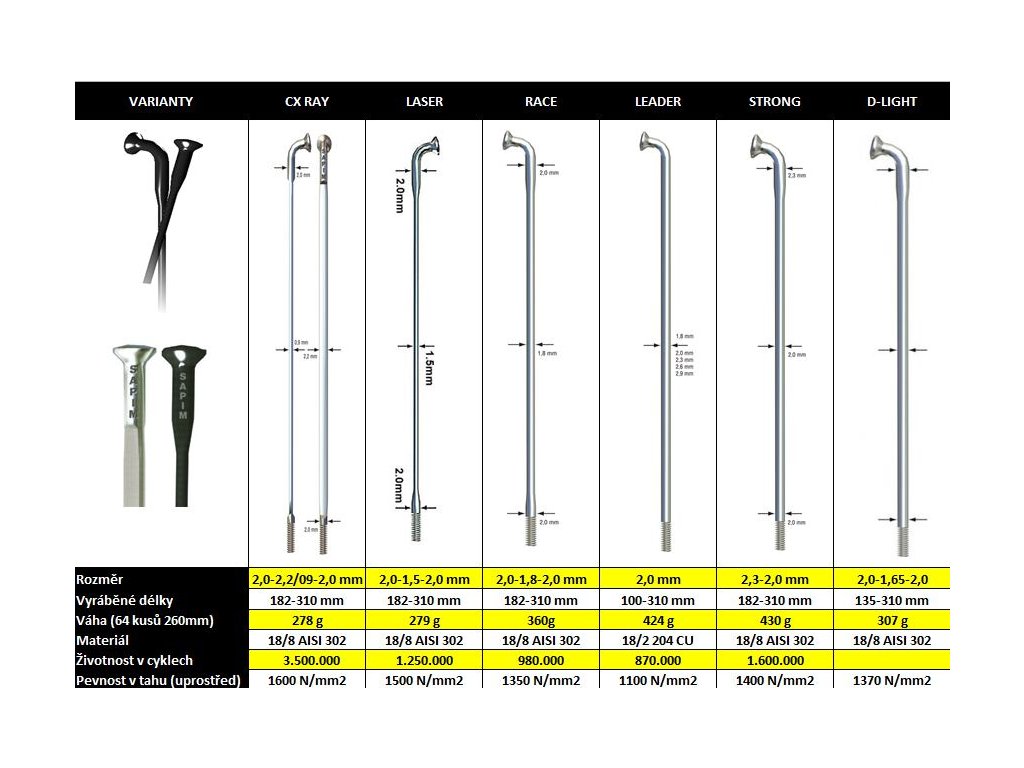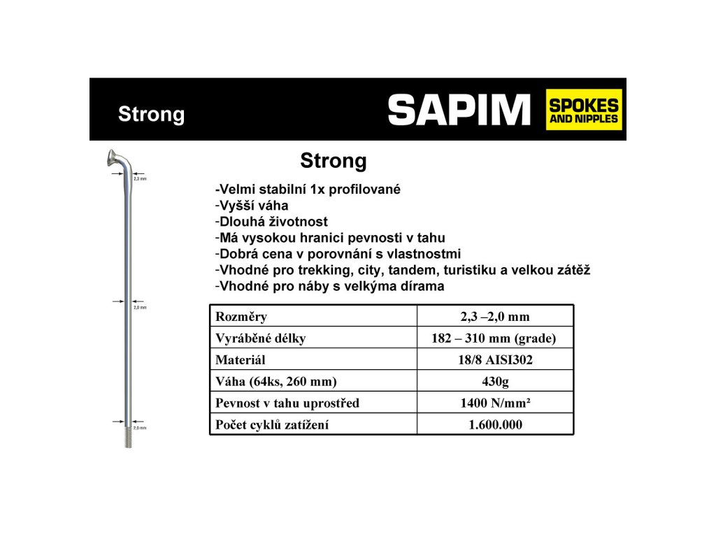 Balení 100 kusů!! STRONG Oboustranně zesílené paprsky se specifickým profilem, který definuje jejich vysokou pevnost. Nejsilnější paprsky v sortimentu Sapim. Strong je určen pro specifické a těžké použití, jako Tandem, e-kola či velkou zátěž. V případě nábojů s velkými středovými otvory, je Strong ta správná volba. Hmotnost: (64 ks x 260 mm ) 446 g Pevnost v prostřední části: 1250 N / mm2 Rozměry Délka: 180-310 mm Průměr: 2,3 - 2,0 mm Provedení stříbrná nebo černá
