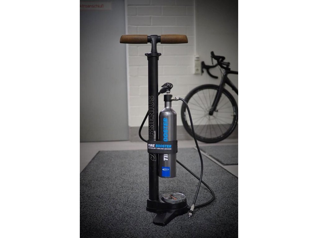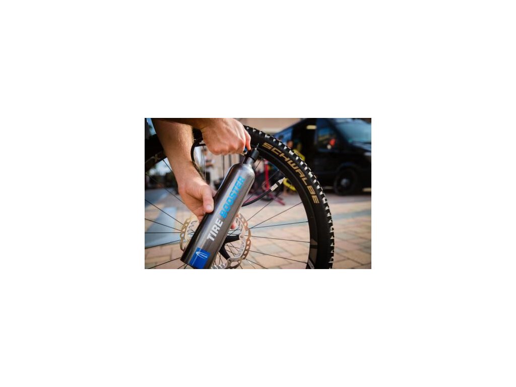 Pro montáž bezdušových plášťů je zapotřebí silný náraz vzduchu, aby si patka pláště sedla do ráfku a tím byl plášť utěsněn. „To se podle kombinace plášť – ráfek se stávajícími pumpami ne vždy podaří“, zmiňuje Peter Krischio, Schwalbe product manager Race. V profi-dílně, nebo u pumpy pomůže kompresor. Pro jistou a jednoduchou montáž bez kompresoru přichází teď Schwalbe s Tire Boosterem, který vznikl díky spolupráci s britskou start up firmou Airshot. Díky němu lze dostat do pláště najednou tlak až 11 barů. „Tím se plášť okamžitě usadí v ráfku a je dobře utěsněn“, říká Peter Krischio. „ Tire Booster je velkou výhodou při tubeless montáži. Se svými 435ti gramy se lehce přenáší.“ Kdo potřebuje ještě vyšší tlak, může použít specielní adaptér. Po odšroubování ventilku a nasazení adaptéru je dosaženo maximálního přímého proudu vzduchu. A takhle to funguje: po napojení běžné autopumpy na ventilek a natlakování lahve, otevřením rychloventilu vnikne vzduch do pláště a hned se rovnoměrně rozdělí. Plášť se, většinou s typickým cvaknutím, usadí pevně v ráfku.Doplňkové parametry