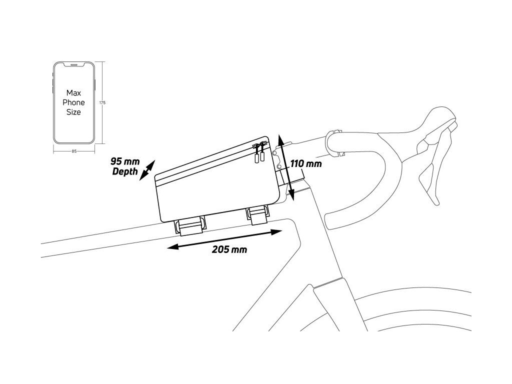Rámová brašna s integrovaným držákem smartphonu. Je ideální pro přepravu smartphonu a malých předmětů (opravárenské soupravy, kazety s CO2, peníze, klíče atd.). Velmi praktické; Dvojitý popruh na suchý zip umožňuje snadné připevnění ke všem typům rámů, a to i těch nejširších, bez rizika poškrábání. Dotyková obrazovka smartphonu může být také použita stejně jako sledování jízdních údajů nebo rychlosti. Integrovaná pláštěnka je součástí balení.Doplňkové parametry